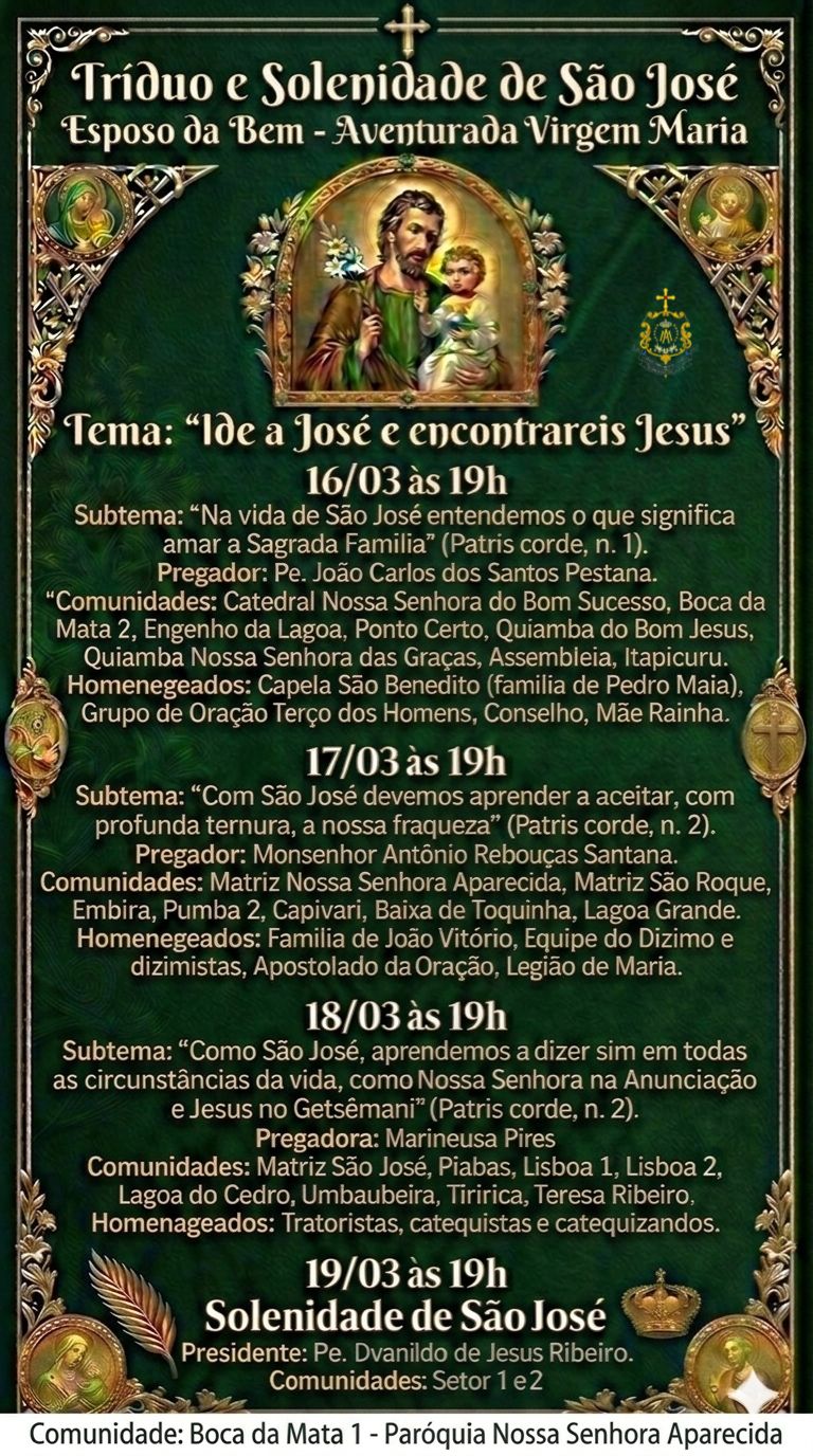 A comunidade da Boca da Mata I, pertencente à Paróquia Nossa Senhora Aparecida, realizará de 16 a 19 de março o Tríduo e a Solenidade de São José, reunindo fiéis para momentos de oração, reflexão e celebração da fé.